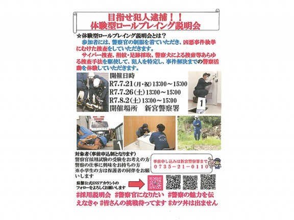 和歌山県警の採用試験受け付けが始まった機をとらえ、新宮署はこのほど、警察官採用試験の受験を考えている人や警察の仕事に興味のある人を対象に、「体験型ロールプレイング説明会」を開催する。21日(月・祝)、26日(土)、8月2日(土)の3回あり... 続きを読む