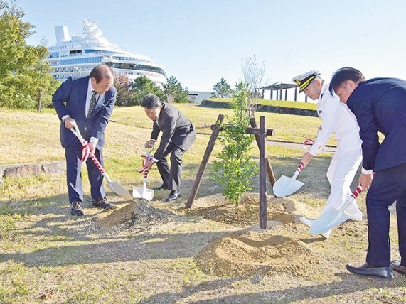 郵船クルーズ株式会社が運航する豪華客船「飛鳥III」(総トン数5万2200トン、全長230メートル)が22日、新宮市佐野の新宮港に入港した。これに合わせて新宮港緑地公園で、就航記念植樹が行われ、神谷敏充船長と上田勝之市長らが飛鳥... 続きを読む
