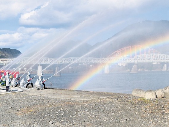 新宮市は11日、同市下本町の丹鶴ホールで、2026(令和8)年の消防出初め式を行った。式典と表彰式で消防団の活動を通じて防火活動に貢献した83人を表彰したほか、上田勝之市長が激励の言葉を述べた。熊野川河川敷ではホースによる一斉放水を実施。... 続きを読む