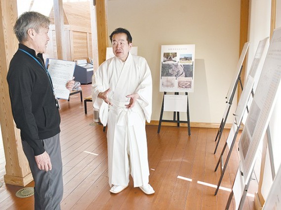 展示パネル前で九鬼宮司(右)と小守館長