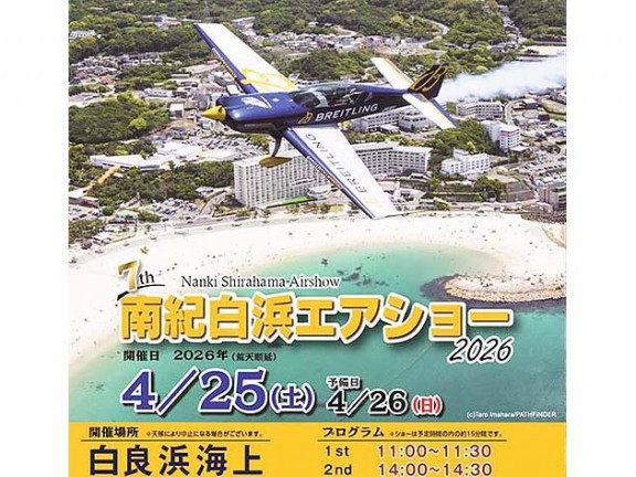 白浜町の白良浜海上で25日(土)に飛行機によるアクロバット飛行を披露する「第7回南紀白浜エアショー2026」(同実行委員会主催)が開催される。2回実施され、1回目は午前11時~11時30分、2回目は午後2時~2時30分で予定され... 続きを読む