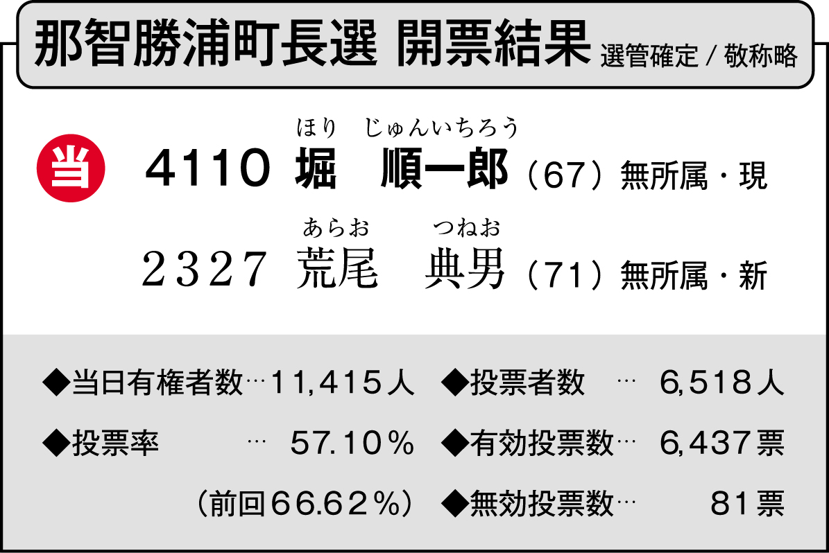 任期満了に伴う那智勝浦町長選は26日、投開票され、現職の堀順一郎(ほり・じゅんいちろう)氏(67)=無所属=が4110票を集め、3選を果たした。堀氏は選挙戦で、町内への複数の津波避難タワーの設置や町クリーンセンターの整備、中学校給食の導入など自身の実績を強調。自民党などの推薦を受け、手堅く支持を集めた。元町議会議員で新人の荒尾典男(あらお・つねお)氏(71)=無所属=は2327票で涙をのんだ。