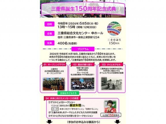 三重県は、誕生150周年記念式典を5月5日(火)午後1時から3時まで、津市一身田上津部田の県総合文化センターで行う。 4月18日(土)に誕生150年を迎えることから... 続きを読む