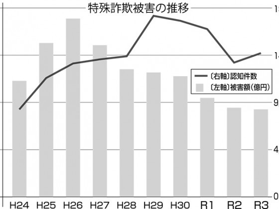 警察庁はこのほど、令和3年中の特殊詐欺の被害状況を取りまとめた。認知件数は1万4461件(前年比911件増、以下同じ)で被害額は278.1億円(7.1億円減)だった。同庁は「被害額は過去最高となった平成26年の565.5億円から... 続きを読む