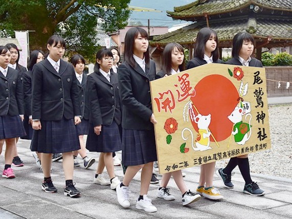 県立尾鷲高校の美術部と書道部が合作した来年の干支(えと)、子(ね)の大絵馬が19日、尾鷲神社に奉納された。破魔矢と御幣を手にした2匹のネズミが朝日を眺める構図で、ネズミが着ている法被には同社の紋様を施している。幅135センチ、高... 続きを読む
