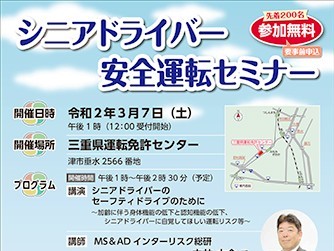 シニアドライバー安全運転セミナーが3月7日(土)午後1時から、津市垂水の県運転免許センターで開かれる。対象はシニア層や家族、シニアドライバーの交通安全に関心のある人などで、参加無料。定員は200人。県や県警などが参加を呼び掛けて... 続きを読む