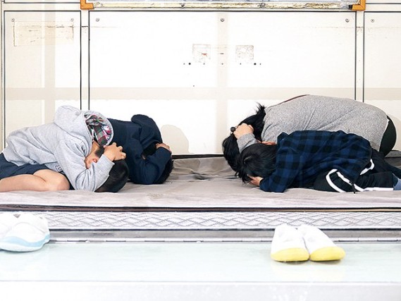 「ダンゴムシのポーズ」をとる児童