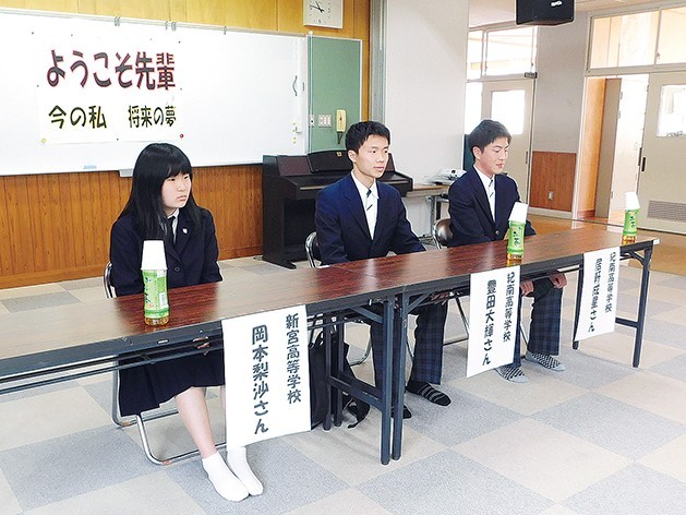紀宝町立相野谷中学校は16日、学校公開Dayに合わせて卒業生を招き、「ようこそ先輩」を開催した。身近な先輩から直接話を聞くことにより、将来への具体的な目標やヒントを得ようと昨年から行っているもので、生徒や保護者は間近に迫った進路... 続きを読む