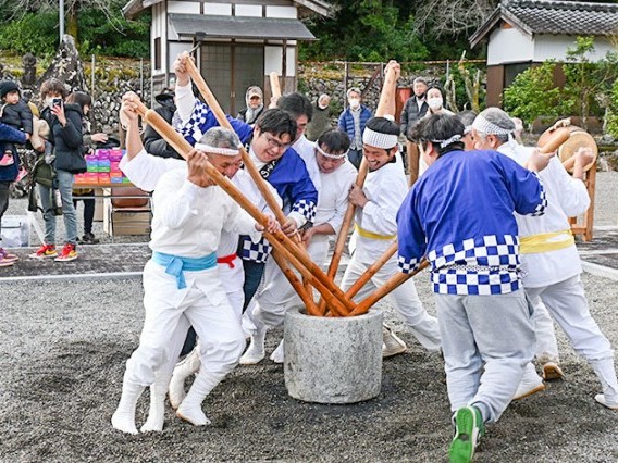 紀北町船津の永泉寺で3日、新春の伝統行事「よその餅」が6年ぶりに行われた。地突唄(じつきうた)に合わせて、白装束の男衆が千本杵(きね)で餅をつき、豊作や無病息災を祈念した。 350年ほどの歴... 続きを読む