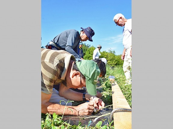 尾鷲甘夏の芽を台木に固定する参加者