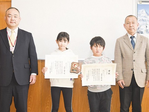 鵜殿小での表彰式(中央左から谷野さん、大倉さん)