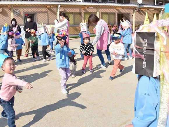 節分の3日、各地の保育園や幼稚園などで「豆まき」行事が行われた。尾鷲市北浦西町の第三保育園では、園児35人のうち年長園児10人が鬼役となって豆まきを楽しんだ。 最初に乳児用の保育... 続きを読む