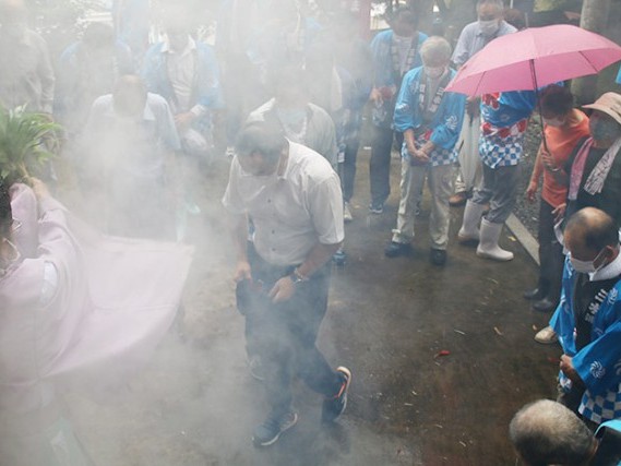 こうべを垂れて湯しぶきを受ける氏子や参拝者