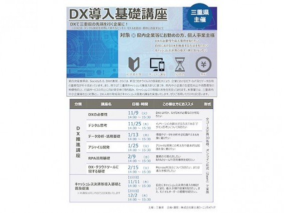三重県は、県内中小企業や個人事業主などを対象にDX(デジタルトランスフォーメーション)導入基礎講座を開く。11月から来年2月にかけて合わせて7つのオンライン講座を計画している。 ... 続きを読む