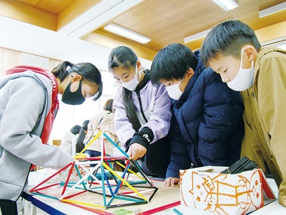 ストローハウスを作成 紀宝町立鵜殿小学校は8日、紀宝町学校防災研修会の一環で