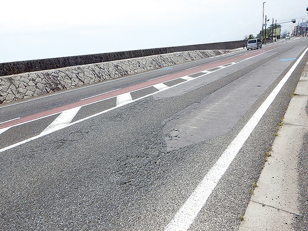 傷んだ舗装(花の窟前上り松阪方面=熊野維持出張所提供)