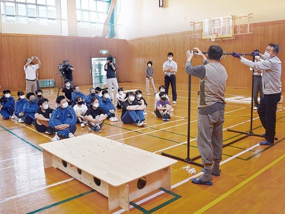簡易ベッドや間仕切り組み立て 紀宝町立相野谷中学校で19日、授業公開日に合わせて人