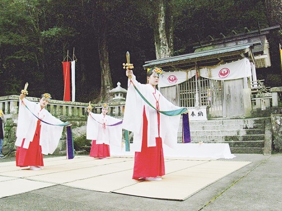 巫女舞 堂々と奉納 紀宝町鵜殿の烏止野(うどの)神社(田中安弘宮司)で23日