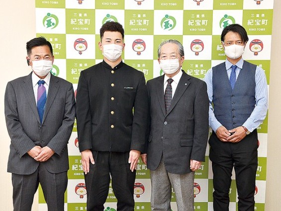 町長や相談員が激励 紀宝町成川の芝下直希くん(18)が4