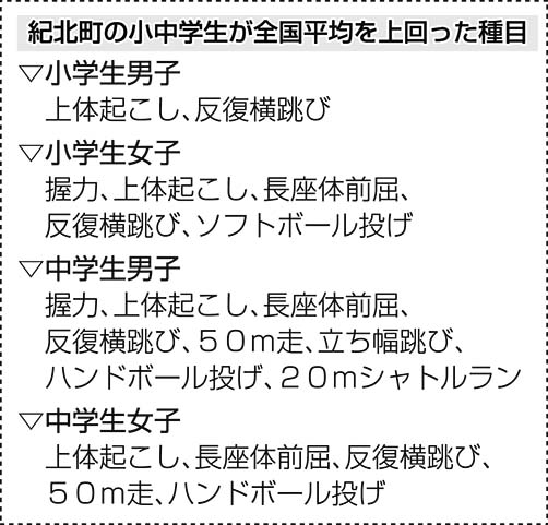 紀北町教育委員会はこのほど、本年度の全国体力・運動能力・運動習慣等調査の結果を公表した。男子中学生が全8種目で全国平均を上回った。一方で、平日の1日で4時間以上テレビやスマホなどを見る男子中学生が4割を超えた。