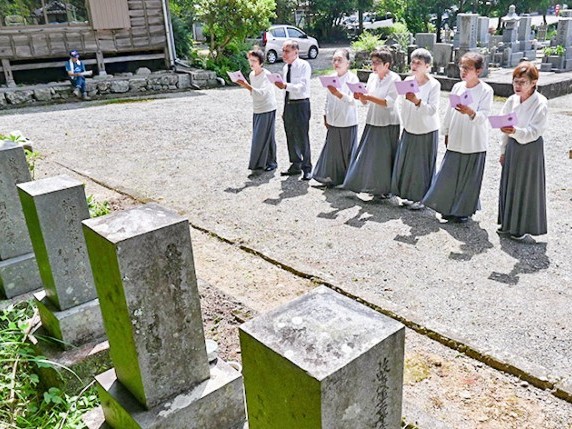 紀北町の有志が19日、中里墓地に眠る英霊14柱に詩吟をささげた。夏空の下で『英霊に捧(ささ)ぐ』を朗々と吟じ、戦後80年の節目に平和の礎となった先人の霊を慰めた。 詩吟を奉納した... 続きを読む