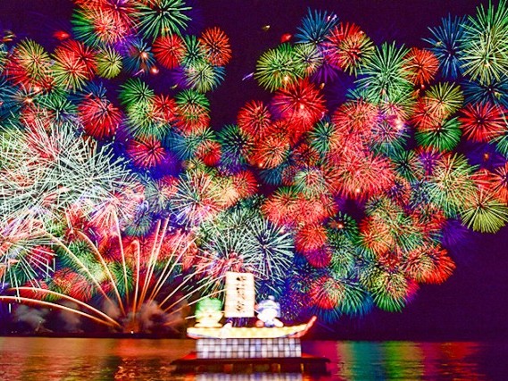 約5万人 花火に見入る きほく燈籠祭が26日、紀北町の紀伊長島港特設会場で行