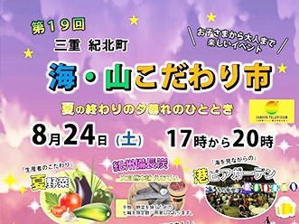 第19回三重紀北町海・山こだわり市が24日(土)午後5時から8時まで、紀北町引本浦の引本港で行われる。夏野菜や干物、地元生産者によるイチジクとイチゴのかき氷といったスイーツを含め、こだわりの品をそろえる。... 続きを読む