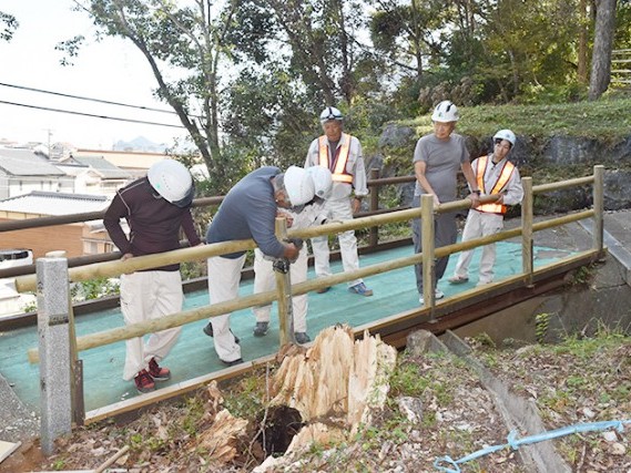 紀北町相賀の塩谷組が13日、相賀の防災避難路を補修する奉仕活動を実施。8月の台風8号の倒木によって破損した橋の欄干を再び取り付け、新しいゴムマットを貼り付けた。 台風により、新町... 続きを読む