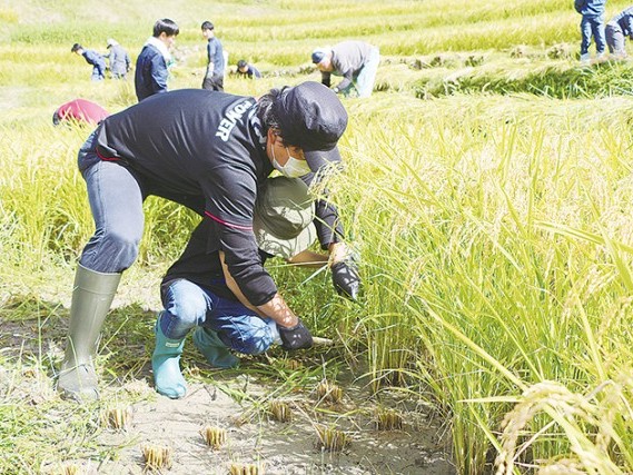 昔ながらの「はさ掛け」も 熊野市紀和町の丸山千枚田で9日、農作業イベントの「