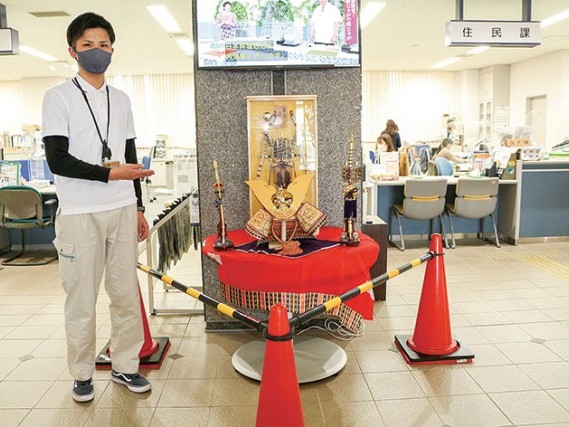 ロビーに節句飾り 御浜町役場1階ロビーで、「こどもの日」の雰囲気が感じられる兜(か
