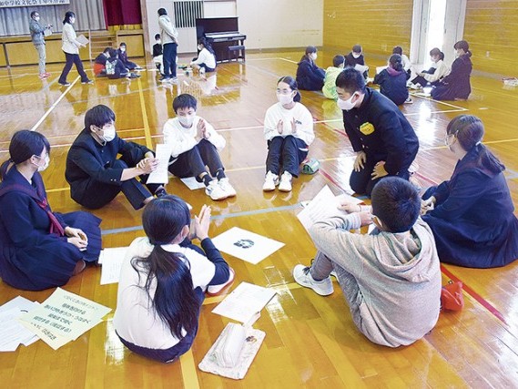 小6児童と合同で 御浜町立阿田和中学校で10日、人権フォ