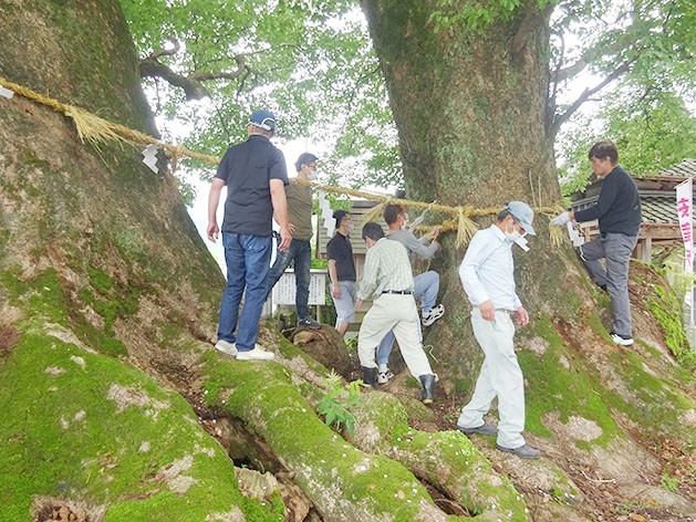尾鷲市北浦町の尾鷲神社で25日、県天然記念物となっている大楠のしめ縄の張り替えが行われた。氏子総代会の役員ら約30人が参加。拝殿正面の二の鳥居横の夫婦楠と、神殿裏の大楠に、直前の日曜日に作っておいた真新しいしめ縄を張り巡らせた。... 続きを読む