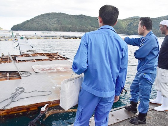 三重県の一見勝之知事が3日、台風7号で被害を受けた尾鷲市古江の県栽培漁業センターを視察した。 秒速20メートルを超える強風と高潮の影響で、海面にある養殖いけすの1基、いけすにつな... 続きを読む