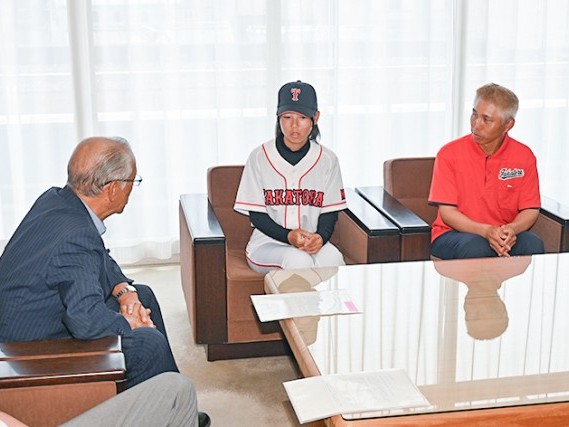 中学女子軟式野球チーム、三重高虎ガールズの一員の武藤妃那子さん(尾鷲中1)が今月に開かれる全国大会を前に4日、加藤千速尾鷲市長を表敬訪問した。武藤さんは「先輩がやりやすい環境をつくって、最後はチームみんなで笑いあえるようしたい」... 続きを読む