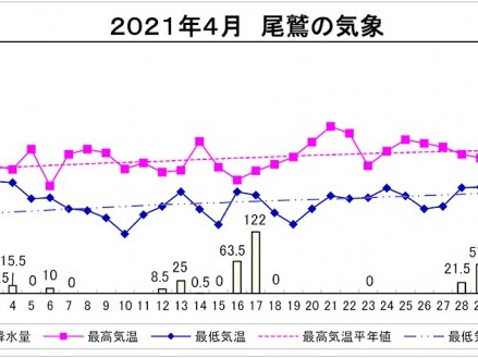 気象庁の観測によると、4月の三重県内は周期的に天気が変わり、暖かい空気に覆われて気温は高くなった。尾鷲でも平均気温は平年を0.4度上回り、1月以降、4か月連続で気温が高い状態が続いている。降水量や日照時間はほぼ平年並みだった。... 続きを読む