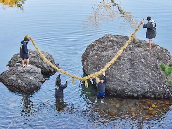 尾鷲市大曽根浦の掛磯で18日、夫婦岩の大しめ縄を張り替える「掛磯神事」があった。法被姿の若者ら4人が、冷たい海に太ももまで入ってしめ縄を運び、このうちの2人がはだしで岩に上って作り上げたばかりのしめ縄を結び付けた。 ... 続きを読む