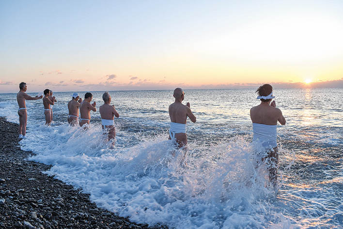 有志らが王子ヶ浜(大浜海岸)で禊。準備体操を行ったあと、ふんどし姿で波打ち際に立ってしぶきを浴び、太陽に向かって手を合わせる。