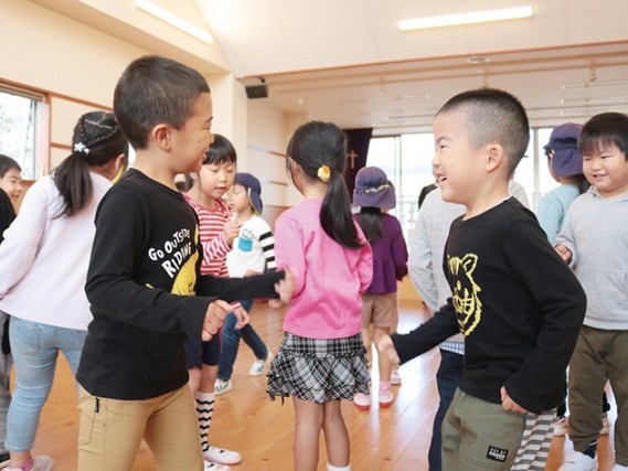 ダンスやゲーム通して 新宮市にある私立マリア保育園はこのほど、市立王子幼稚園を招き、同園で5歳児の交流会を実施。マリア保育園児20人と王子幼稚