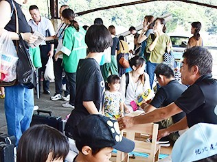汗ふきながら催し楽しむヒノキの椅子作りやミニゲーム