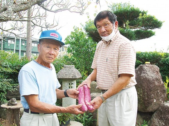 サツマイモと農家の男性(左)と農業仲間の男性(右)