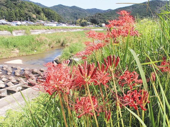 相野谷川沿いで彼岸花 ◎…紀宝町大里、相野谷川にかかる相野谷橋の