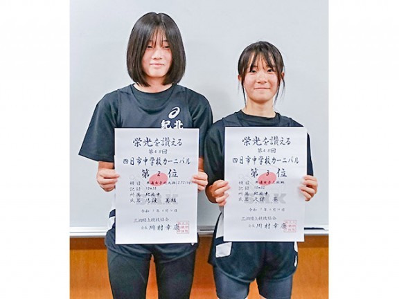 第48回四日市中学校カーニバル(主催・三泗陸上競技協会)がこのほど、四日市中央緑地公園陸上競技場で開かれ、紀北中学校の3年生女子2人が3種目で入賞。馬渡実結さんが砲丸投げで準優勝、久保葵さんが三段跳3位と走幅跳5位の成績を収めた... 続きを読む