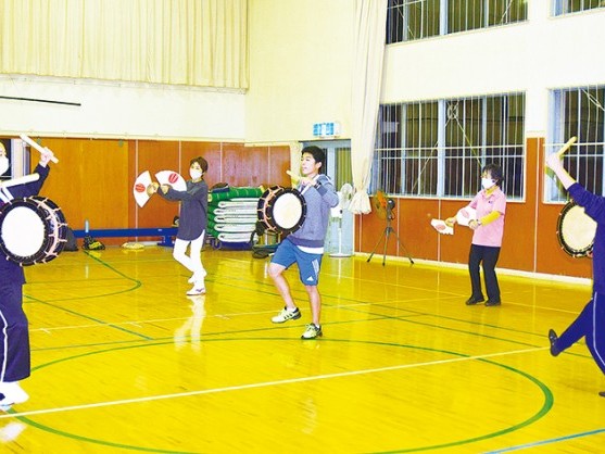 「大瀬の太鼓踊」の稽古(中央が梅田くん)