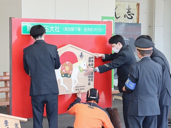新宮市徐福のJR新宮駅で16日、新年の干支(えと)「午」(うま)を描いた、熊野三山の絵馬の掛け替え作業があった。各大社の宮司が自ら描いた、力作の絵馬3点が1番線ホームに並んだ。 熊野速玉大社... 続きを読む
