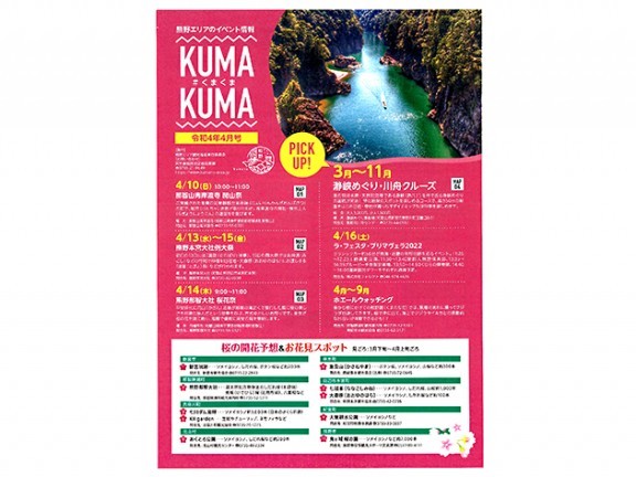 熊野エリア観光推進実行委員会はこのほど、観光情報紙「くまくま」4月号を発行した。旅行者のもてなしと、誘客を図る情報ツールとして、イベントや祭りなどの地元ならではの旬の情報をまとめた観光情報紙を毎月1回発行。県東牟婁振興局や市町村... 続きを読む