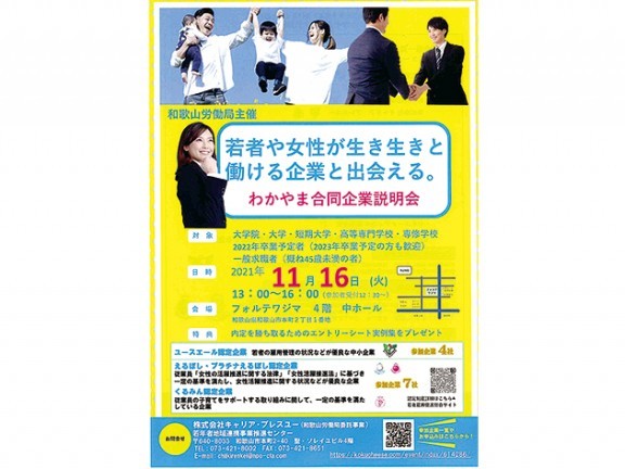 和歌山労働局は11月16日(火)午後1時~4時、和歌山市のフォルテワジマ4階中ホールで「わかやま合同企業説明会」を開催する。 対象は、大学院・大学・短期大学・高等専門学校・専修学... 続きを読む