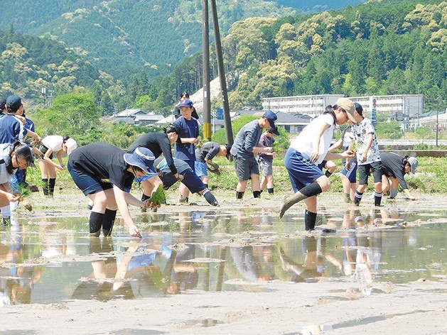 熊野川町の田んぼで指導受け 近大附属新宮中学校は24日、毎年恒例の「ふるさと