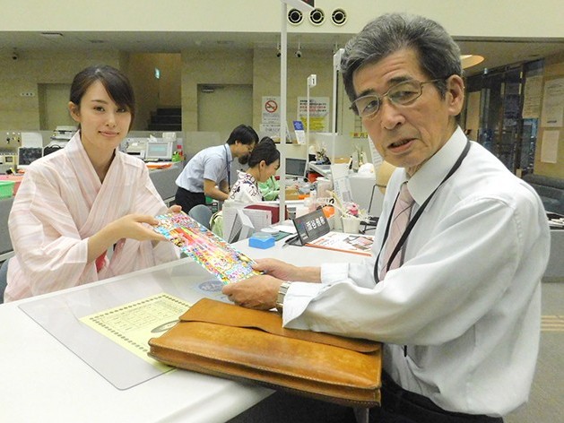七夕にちなんで新宮信金 新宮信用金庫は5日、各支店で七夕イベントを実施。花柄などの色鮮やかな浴衣姿の職員が、来店者を迎えた。