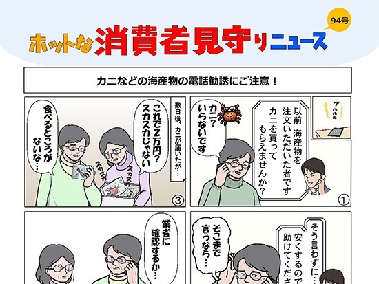 和歌山県消費生活センターは、ホットな消費者見守りニュース第94号を発行した。今回は「カニなどの海産物の電話勧誘にご注意!」。 同センターには、海産物の電話勧誘トラブルに関する相談... 続きを読む