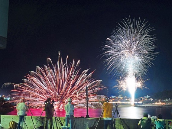 約4万人 夏の一夜満喫 第57回新宮花火大会・熊野徐福万燈祭(熊野徐福万燈祭実行委員会主催)が20日夜、熊野川河川敷